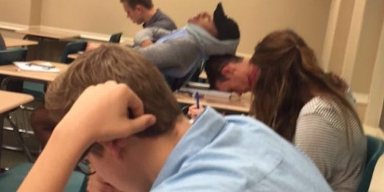 After all, two students in the back of the photo are sleeping in the middle of their tests with their heads on top of one another -- totally normal. A+ for sure.