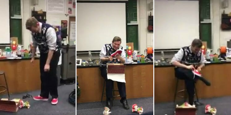 For some reason, people fell in absolute love with the teacher lacing up his new kicks and modeling them for his students.