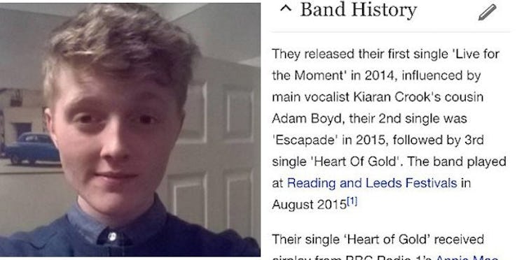 Boyd didn't just edit the page to lie about his relation to Kiaran Crook, the lead vocalist of The Sherlocks; he actually claimed he was the influence behind one the band's hit singles.