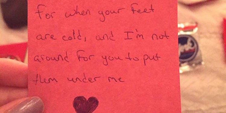 If that's not enough to make you shed some tears of joy (or make you cry about the fact that you're still single and lonely), Grace's boyfriend left another note on the bed that read, "The socks are for when your feet are cold, and I'm not around for you to put them under me."