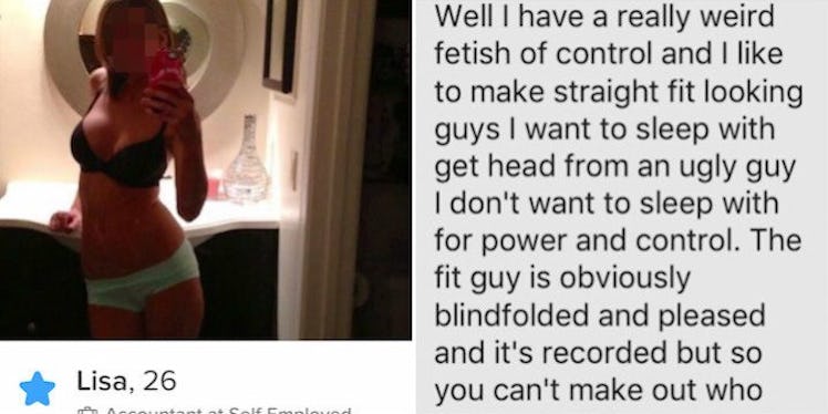 In order to manifest that, her preferred fantasy includes a "straight-fit looking guy" who she would want to sleep with, but before that can happen, that guy must be blindfolded and "pleased" to receive a blowjob from an "ugly guy I don't want to sleep with."