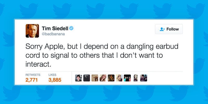 Sorry Apple, but I depend on a dangling earbud cord to signal to others that I don't want to interact. — Tim Siedell (@badbanana) September 7, 2016