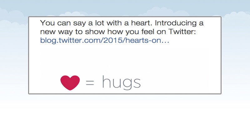 Citations: Twitter officially kills off favorites and replaces them with likes (The Verge), Hearts on Twitter (Twitter)