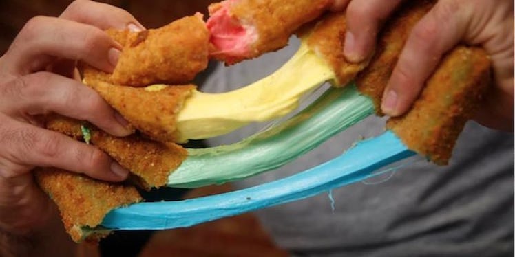 The homemade mozzarella is dipped in food dye to unleash those unicorn hues everyone's come to love. From there, the colorful cheese bits are dipped in an egg-flour-breadcrumb mixture and fried to magical, mystical perfection. The finished product is what dreams are made of: rainbow-tinted cheese that's not only tasty, but totally worthy of an Instagram story or two. Biting in to see which color you've chosen adds an element of surprise. (No need to thank me for tips to up your social media game.)