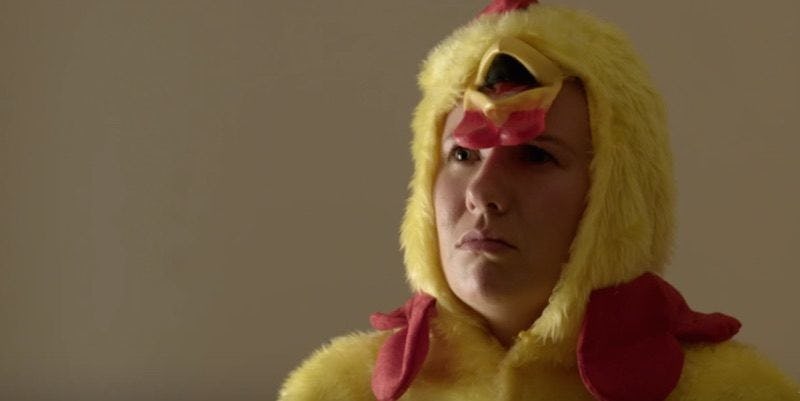 The kicker? She's wearing a chicken suit — a far cry from the “revealing” clothing the detective accuses her of wearing.