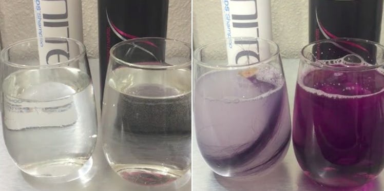 Then, Rachel added hair that was dyed purple to each glass and stirred the shampoo water once again with the hair inside.
