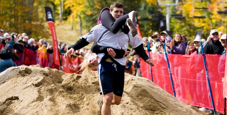 The sport involves men physically carrying their wives through a Tough Mudder-like, 278-yard obstacle course filled with log hurdles, sand traps and one water-based challenge.