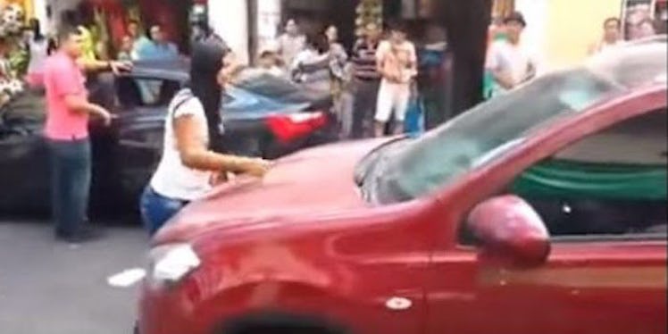 In a video reportedly taken in Ibagué, Colombia, Adalia Brinez is not afraid to position herself directly in front of her husband's car in the middle of the street and demand the “puta” in the passenger's seat hop out.