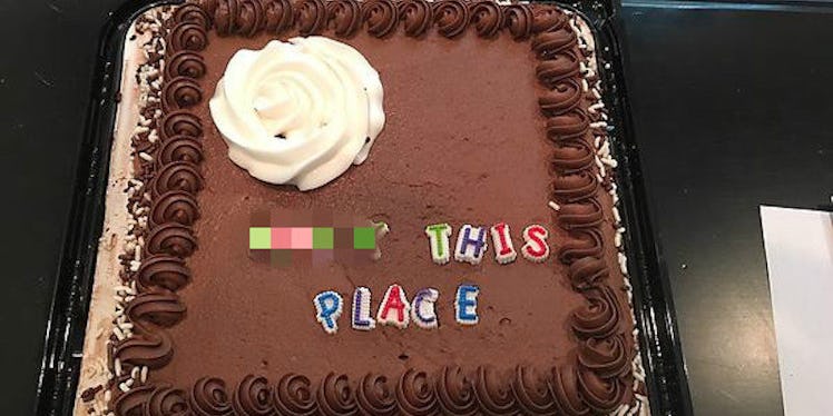 Her friends at work surprised her with the most epic going away cake, that reads, “Fuck this place,” complete with chocolate frosting and everything.