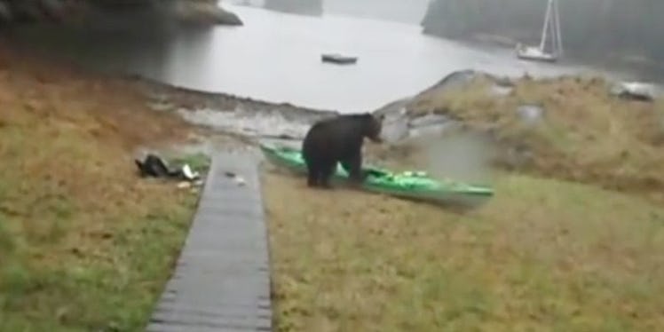 Get away from that kayak, come here… STOP IT, BEAR… BEAR! BEAR! BEAR! You're BREAKING it! You're BREAKING my kayak! Why are you doing that?! Why are you breaking my kayak?!… BEAR! STOP THAT! STOP THAT, BEAR!… GOSH DARN IT… BEAR! It's the end of September, why are you here?! YOU'RE SUPPOSED TO BE ASLEEP!… BEAR!