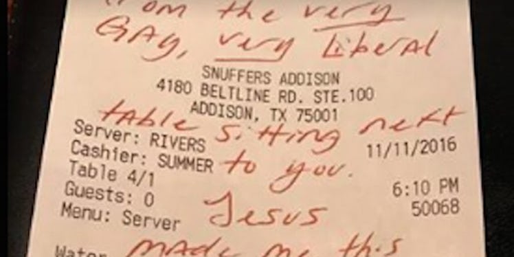 Woods later posted a photo of the bill on her Facebook page, and now lots of people are buzzing about this woman's bold note to the family having a homophobic convo about their gay cousin.
