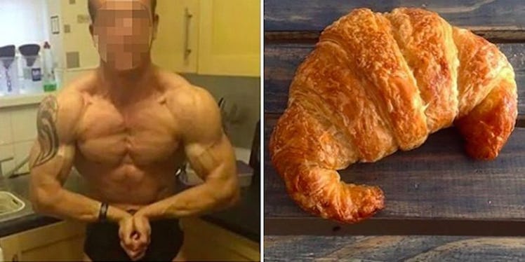 I'm not sure if it's the way this man is flexing his arms into a weird AF crescent shape, his golden-brown complexion or simply a combination of the two, but it's not hard to see why she thinks this man basically looks like a lumpy croissant trapped inside the muscular body of a fuckboy.