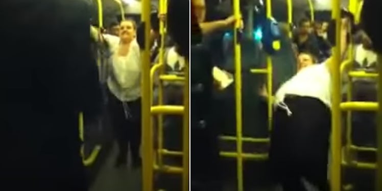 "Watch this space," she yells before nabbing him in the mouth. The man, who by this point is getting rather worried, puts his arm out to keep the woman from attacking him and yells to the driver to stop the bus.