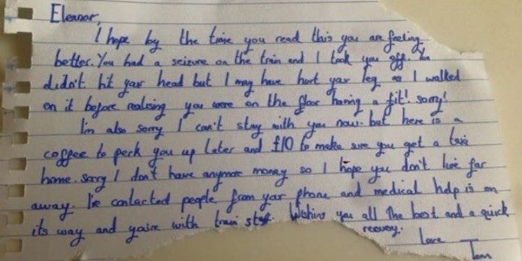 Eleanor. I hope by the time you read this you are feeling better. You had a seizure on the train and I took you off. You didn't hit your head but I may have hurt your leg as I walked on it before [realizing] you were on the floor having a fit! Sorry! I'm also sorry I can't stay with you now, but here is a coffee to perk you up later and £10 to make sure you get a taxi home. Sorry I don't have anymore money so I hope you don't live far away. I've contacted people from your phone and medical help is on its way and you're with train staff. Wishing you all the best and a quick recovery. Love Tom.
