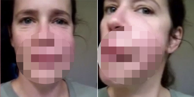 The woman in this video was stung on the lip by a paper wasp, which caused her face to massively swell from what I can only imagine is an allergic reaction. Her top lip and cheek basically tripled in size.
