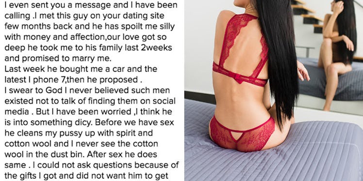 Apparently, her boyfriend seems to be into some weird shit because the woman writes, "Before we have sex he cleans my pussy up with spirit and cotton wool and I never see the cotton wool in the dust bin. After sex he does same."