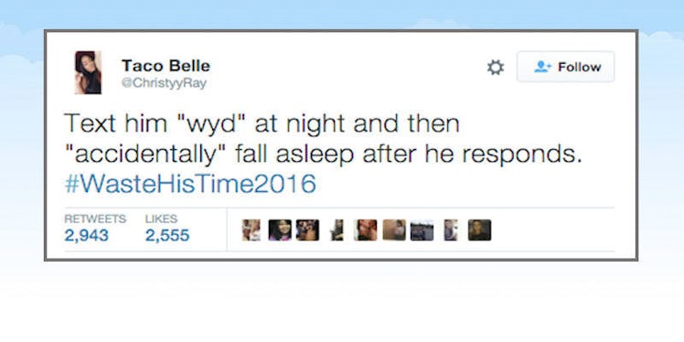 Women are tweeting ways to stay 10 steps ahead of the f*ckboys with #WasteHisTime2016. The tweets are savage, soul-crushing things to do to guys, and frankly, the best clap backs I've ever seen to the torture so many women face all the time.