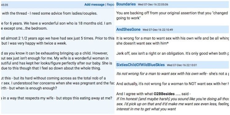From then on, the floodgates were opened. Women began accusing him of trying to manipulate his wife just to get "some." In general, the most negative responses all echoed the same message: You're not entitled to sex with her.