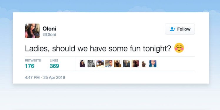 Ladies, should we have some fun tonight? — Oloni (@Oloni) April 25, 2016