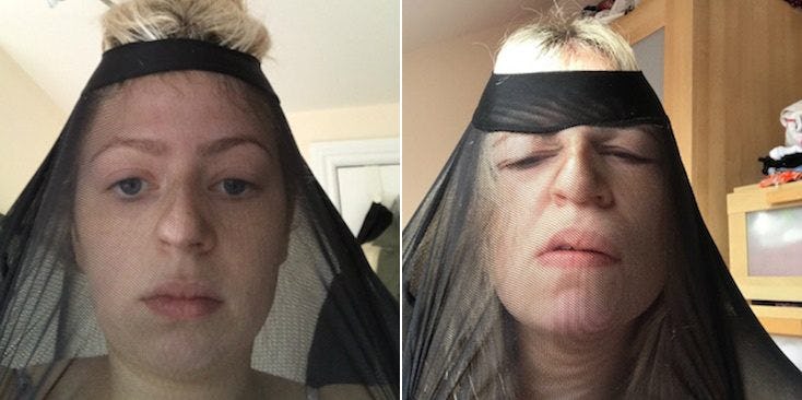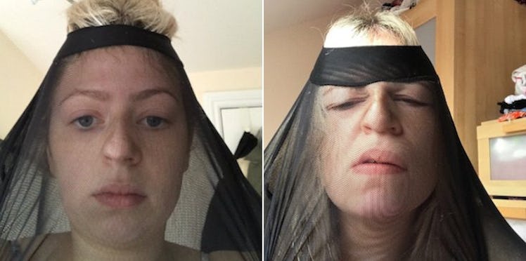After she posted the pictures of her face smooshed against the black mesh, Twitter users began commenting on the tiny neck hole, claiming "these are unrealistic skull expectations."
