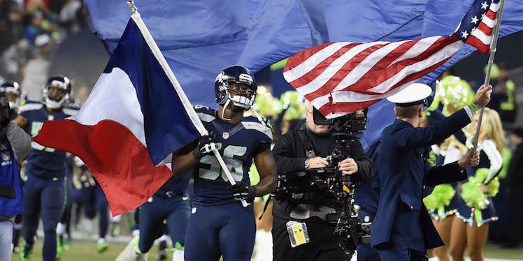 The #Seahawks & #Cardinals run out on the field with the #French Flag #AZvsSEA #k5sports pic.twitter.com/1ClCiHK7mV — Alan Reed (@areedk5sports) November 16, 2015