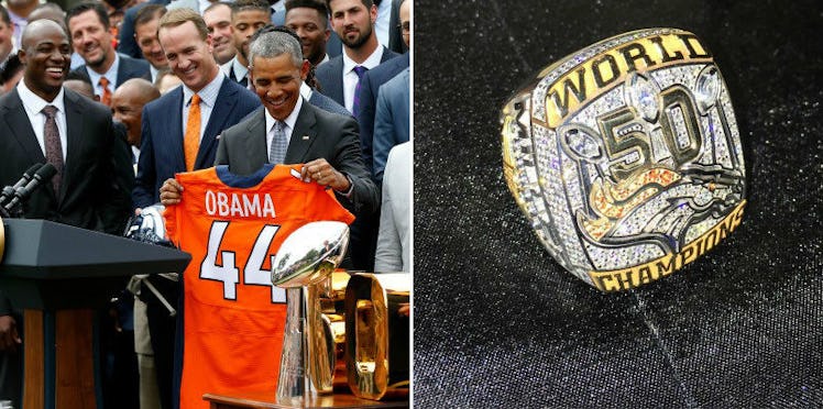 According to reports, the ring features the Super Bowl 50 logo and championship trophy on top. The sides showcase 56 stones to highlight the Broncos' 56 years in the NFL.