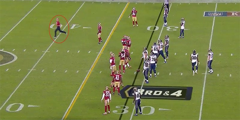 The streaker's run was arguably the most exciting thing that happened during an otherwise uncompetitive game that saw the 49ers rout the Rams 28-0.