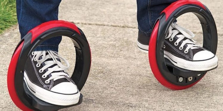 Instead of a board, riders place their feet in 10-inch wheels, which can go on pavement, “short grass and dirt surfaces.”