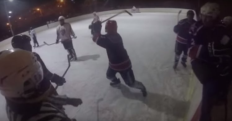 He hits the ref so hard his helmet — which has a GoPro camera attached — is sent flying across the ice.