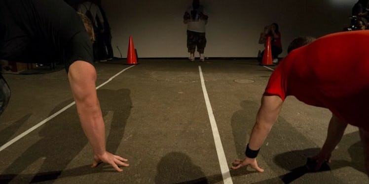 After box jumps, I was instructed to do a variety of stop-and-start sprints. For some reason, my group only had two participants, so JJ actually decided to line up next to me and challenge yours truly to a race.