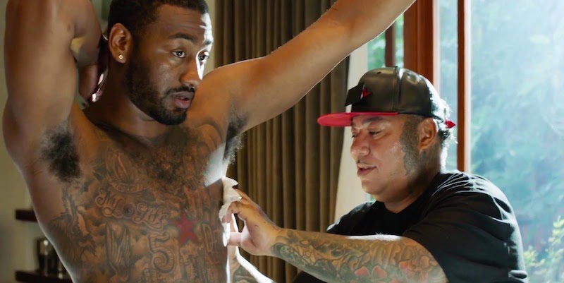In this video, Wall explains those stories and the inspiration for his latest tattoo, a scene of him superimposed over an image of Jesus Christ walking in a valley.