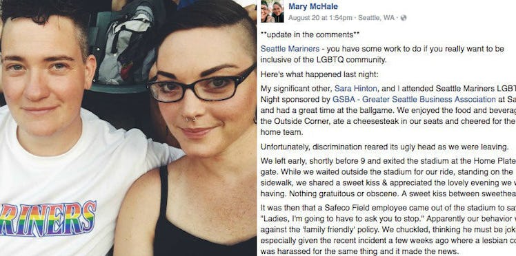 So get this: Mary McHale and her partner Sara Hinton were at the Seattle Mariners LGBT Night on August 19, when a Safeco Field employee told the couple their behavior was against the team's "family friendly" policy, reports the Daily Mail.