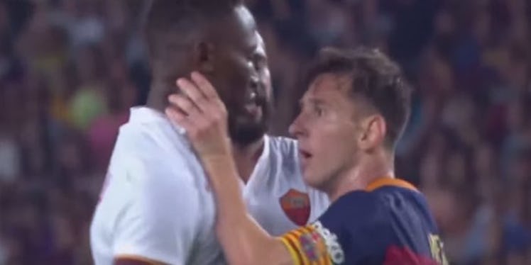 The world's best player, who rarely allows his cage to be rattled, was put off by the actions of Roma's Mapou Yanga-Mbiwa, which resulted in Messi headbutting and grabbing Mapou's throat.