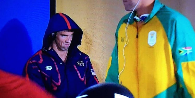 US Olympic gold medalist Michael Phelps was seen pulling the most aggressive expression in the ready room while waiting to compete.