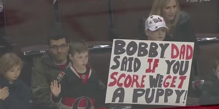 Apparently, Ryan saw the sign during Ottawa's pregame skate and felt pressure to win the kids a puppy.