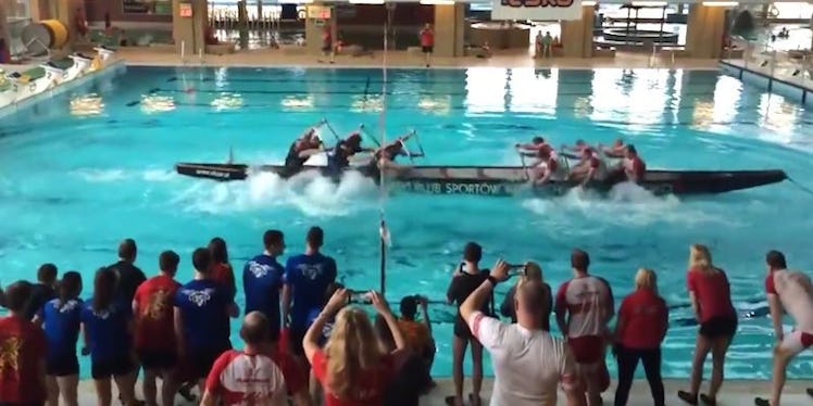 The sport, as you can see in the video, requires two teams, each rowing furiously in an effort to push their side of the boat past the center line in the middle of the pool.