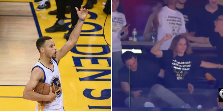 Woooo! As you can see in the above clip, though, the guy Sonya got real close with isn't Steph's dad, Dell Curry. You can also see her husband, Dell, wasn't thrilled about how his wife celebrated their son's shot.