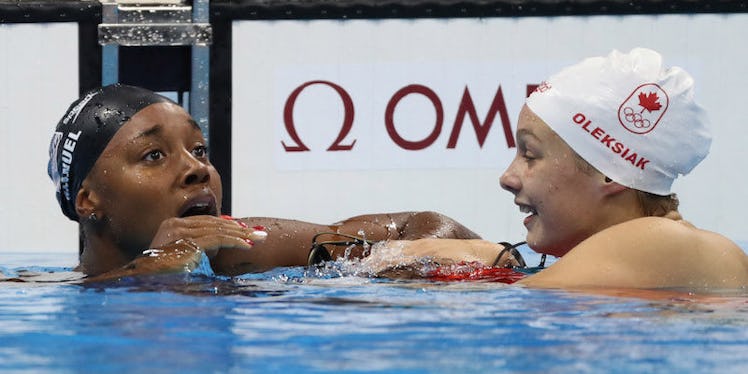 The 20-year-old tied with Penny Oleksiak of Canada in the 100 meter freestyle, setting a time of 52.70 seconds.
