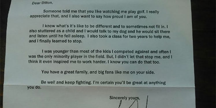 The world's most recognizable golfer sent this heartfelt letter to a young fan who struggles with stuttering, was tortured by bullying and had contemplated suicide.