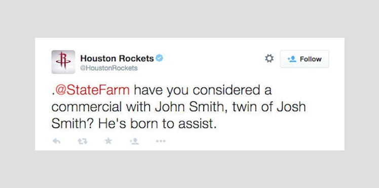 .@StateFarm have you considered a commercial with John Smith, twin of Josh Smith? He's born to assist. — Houston Rockets (@HoustonRockets) April 22, 2015