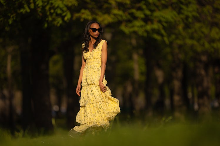 Crafted from a lightweight, breathable 100% cotton poplin that’s perfect for the hottest summer nights, this on-trend maxi dress features puffed sleeves with elastic cuffs, a ruched sweetheart neckline, a ruffled tier at the hem, and a striking cut-out back with an adjustable tie. It’s adorned with a floral print in a gold-toned hue that’s eye-catching yet subtle enough to function as a neutral, meaning it’ll match with pretty much everything. Paired with heels and a clutch, it’s an undeniably chic choice for a summer wedding — but you can just as easily dress it down for a more casual event with strappy sandals or flats.