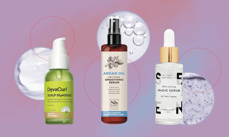 When you're styling hair that's naturally curly, starting with a serum is an essential step. "Serums act as a coating to protect your hair and scalp," celebrity hairstylist Felicia Leatherwood explains to Elite Daily, adding that they can also help defend hair against damage caused by styling tools and environmental stressors. The best serums for curly hair will give you other hair-enhancing benefits in addition to providing protection. "You want a serum that can stimulate the scalp, promote stronger hair, give you a great shine on your hair without clogging your pores, and support the coarseness and thickness of your hair as well as [growth]," Leatherwood says. To manage all of this, Leatherwood recommends looking for ingredients like vitamin E, biotin, amino acids, and plant or nut extracts like castor seed, argan, coconut, and sweet almond oils.