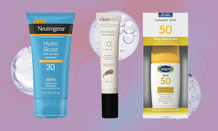 When you have skin that gets oily in some spots and dry in others, it can be tough to find the right sunscreen. So, Elite Daily turned to a professional to help. According to dermatologist Dr. Rebecca Marcus, the best sunscreens for combination skin are oil-free, non-comedogenic, and lightweight. Dr. Marcus prefers mineral — also known as physical — sunscreens for patients with acne-prone skin, so if you fall into that category, look for sunscreens that list zinc oxide or titanium dioxide as the key active ingredients. Sunscreens that contain nourishing ingredients like hyaluronic acid and ceramides are great, too, the expert says, since they moisturize skin while protecting it, which can cut down on the number of products you need to apply.