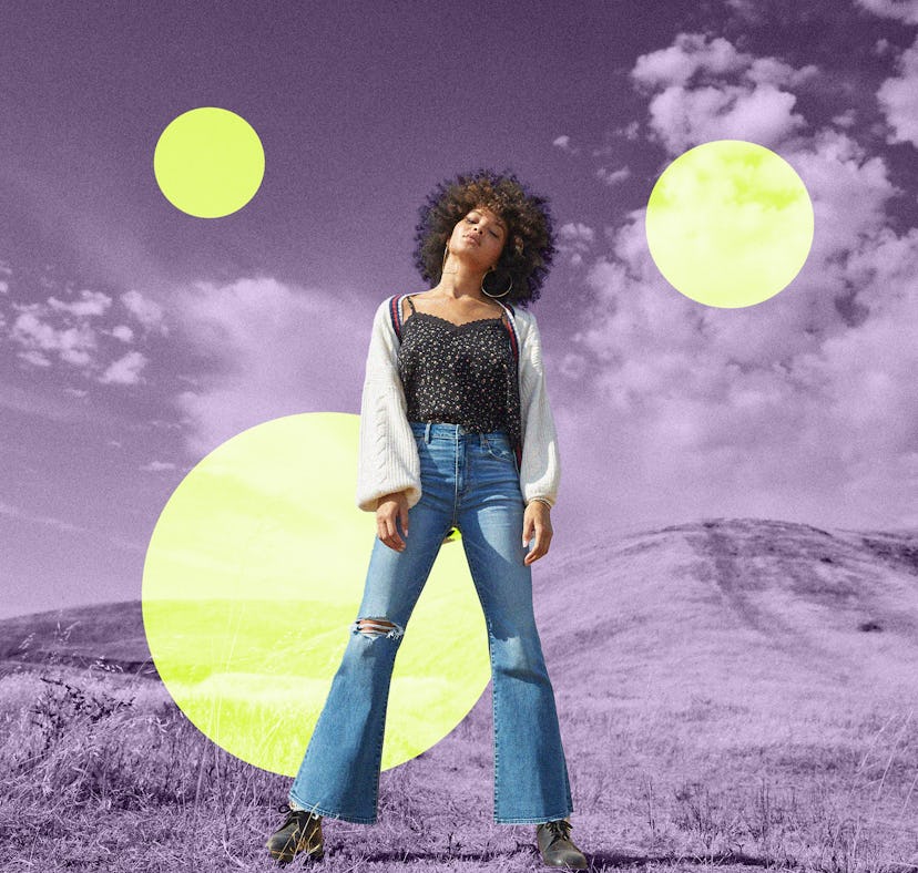 Ever since the trend’s explosive resurgence last year, Y2K-inspired pieces have been go-tos for fashion enthusiasts everywhere. In Los Angeles, halter tops, flare jeans, cropped tops, and vibrant midi skirts have become the standard for night-out looks and brunch dates alike. If you’ve been meaning to try this style out for yourself, start by investing in a pair of high-rise flare jeans, as they’re an essential base for any Y2K outfit. Crop tops are also key components of the early aughts look; here we’ve teamed a baby tee with a cropped knit zip-up to pay homage to the heyday of your favorite sassy doll collection (hint: oversized heads ring a bell?).