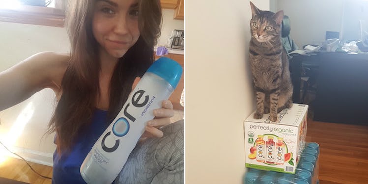 Sure, 64 ounces is a lot of water (as you can see, as my cat Aria perches atop cases on cases on cases of H20), but once you get yourself in the habit of drinking anywhere close to that number, your body will thank you.