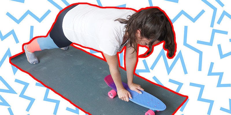Grab a skateboard (I'm using a 22-inch Penny board in a colorway I wish I could dye into my hair), yoga mat and towel. We're ready to ride — well, mostly stand. But we'll get to that. Be ready to work hard and sweat a weird amount. I'd recommend 10-15 reps per set.