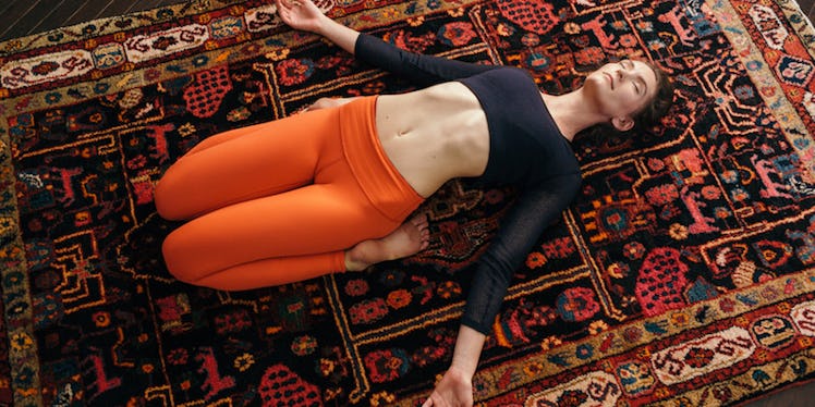 Each person is laying down in the “Savasana” yoga position on a mat on the floor.
