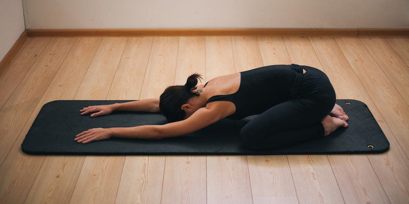 There's something about curling up in a tight, little ball that does wonders for anxiety, and Child's Pose is exactly that. Start on all fours, and bring your knees apart and toes together. Slowly bring your butt toward your feet and rest with your arms extended, or bring your arms alongside your legs.
