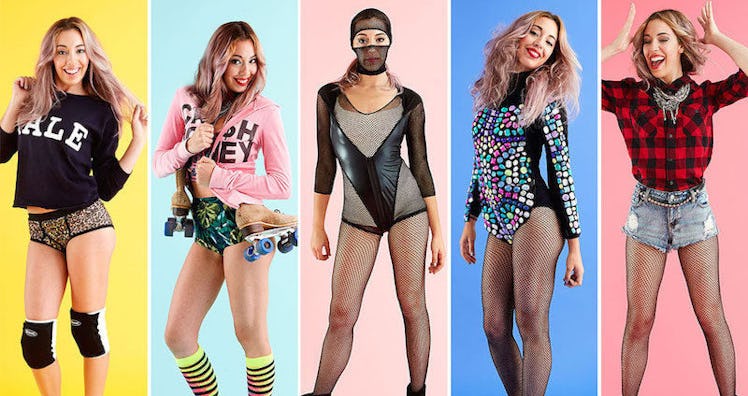 Let's just say our life has never been the same since Beyoncé dropped her visual album. This look is straight from her music video for her song "Blow." We headed to our local thrift store to grab a pink zip up, and we then added the words CA$H MONEY with iron-on transfer paper. The tropical briefs we picked up from American Apparel, and the crop top was from Forever 21. Look for tropical neon pieces for this look. Top it off with a chunky silver necklace and roller skates for accessories.
