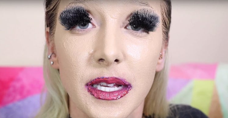In her July 21 video, Jenna takes on 100 layers of glitter nail polish, spray tan, hairspray, foundation, liquid lipstick and false eyelashes — at the same time. Over the course of 7.5 hours, she painstakingly slathers on paint-like formula and shellacs her hair into oblivion, all while boyfriend Julien comments in the background. (At one point, he helpfully adds, "Your arm looks like a hotdog!")